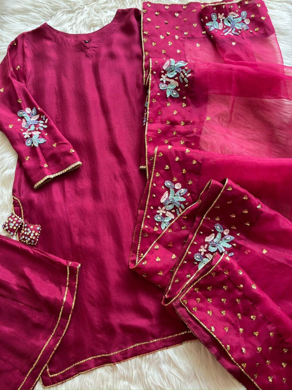 Be the first to review “Ethereal Bloom – Hand-Embroidered Silk Suit with Organza Dupatta”