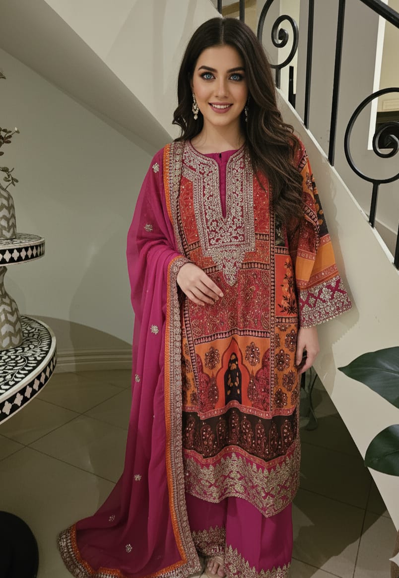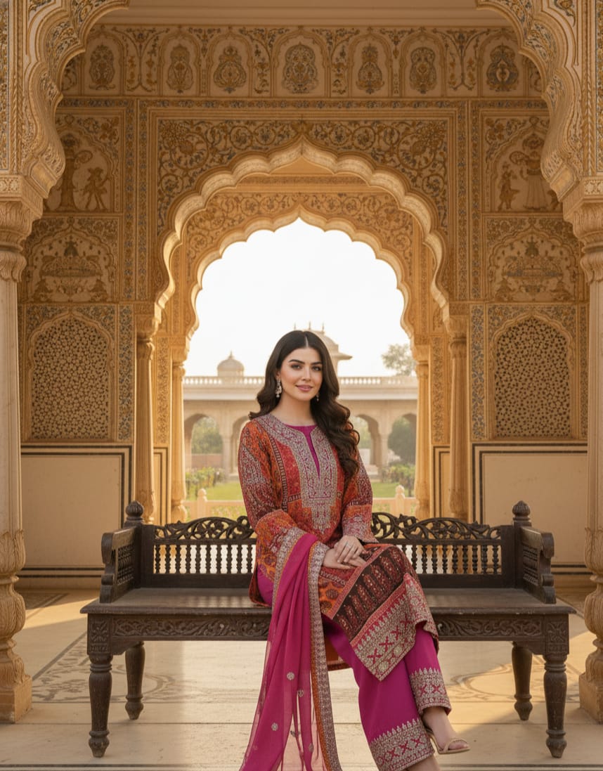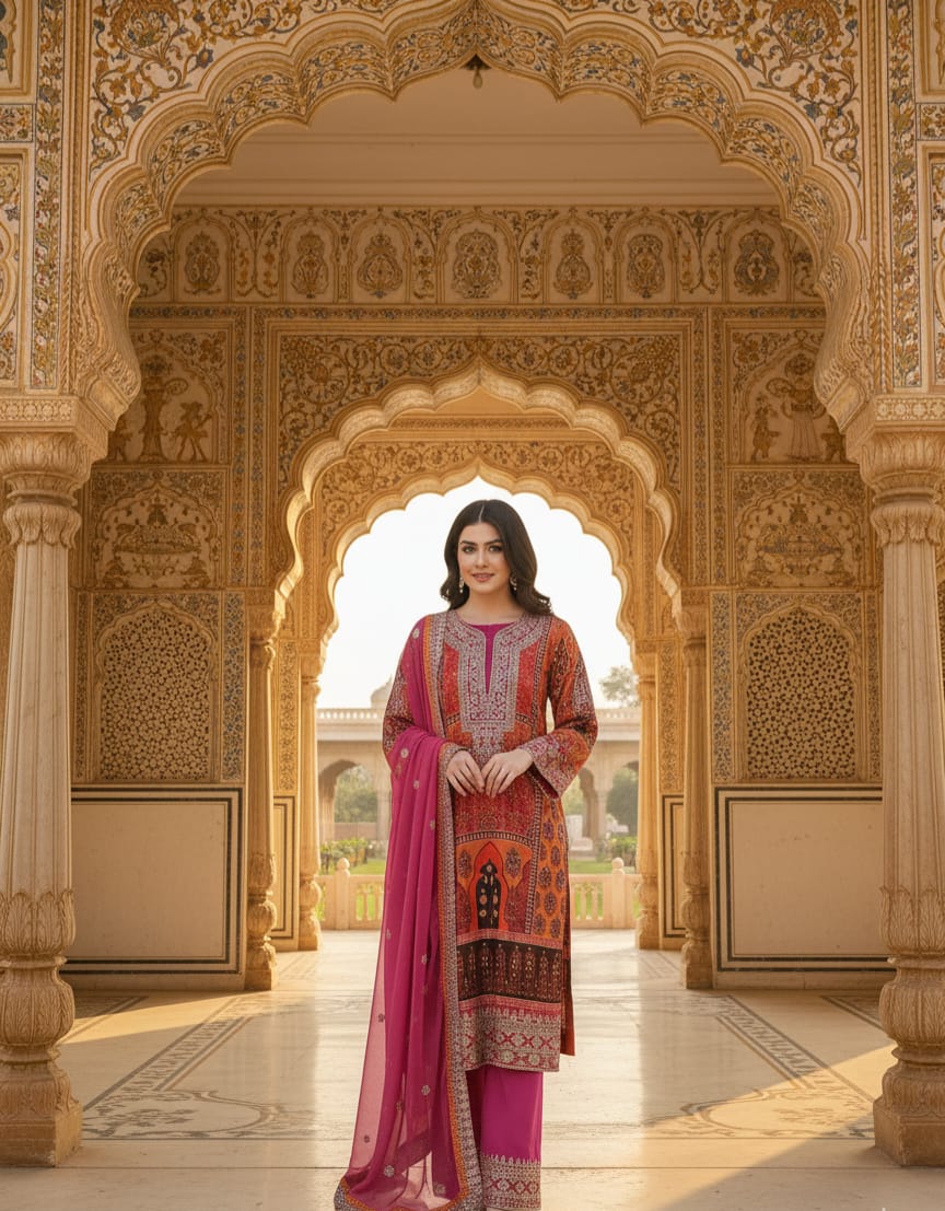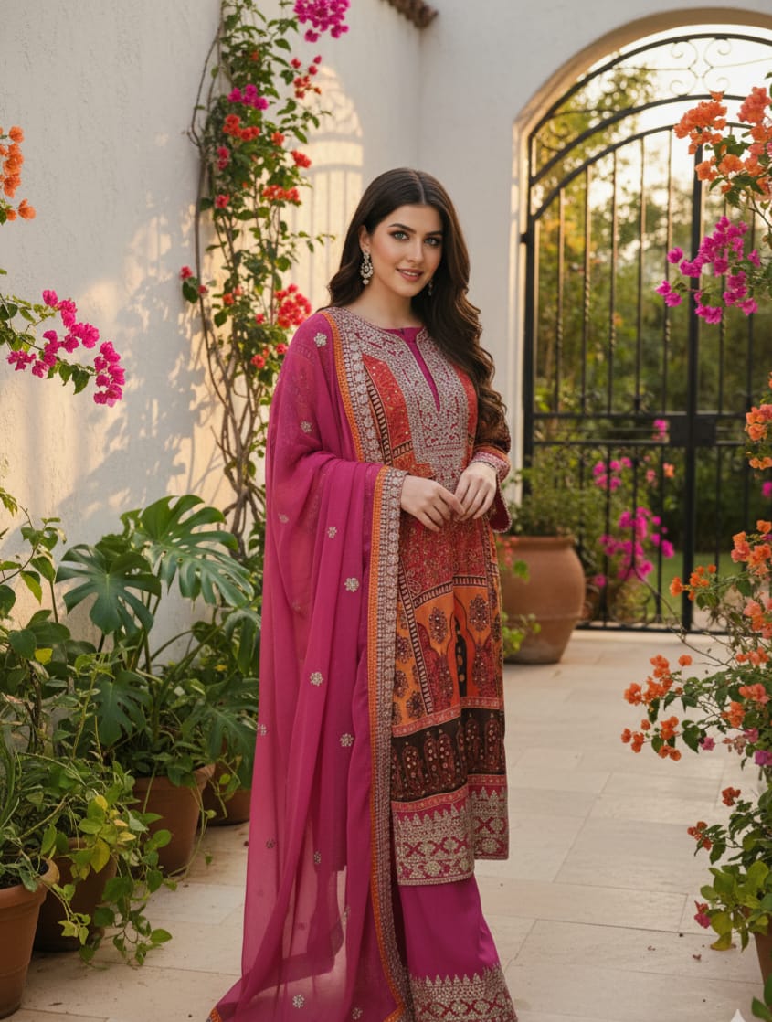 Radiate elegance this season with our Majestic Magenta embroidered three-piece suit — a perfect harmony of traditional artistry and modern grace. The intricately detailed shirt features exquisite thread embroidery in warm tones of rust, maroon, and gold, beautifully contrasted against a magenta base. Complemented by a soft chiffon dupatta adorned with delicate motifs and a matching embroidered trouser, this ensemble captures the charm of timeless craftsmanship.