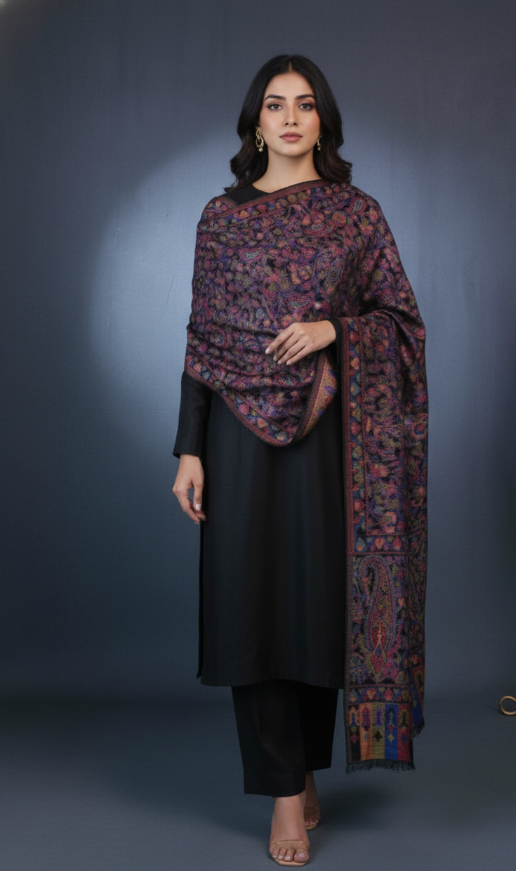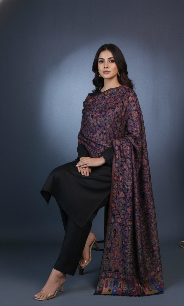 Indulge in the unmatched luxury and traditional splendor of this exquisite 3-piece Pashmina suit, designed for both supreme warmth and dramatic style during the colder months. This ensemble seamlessly blends a chic, minimalist base with a breathtaking statement shawl.