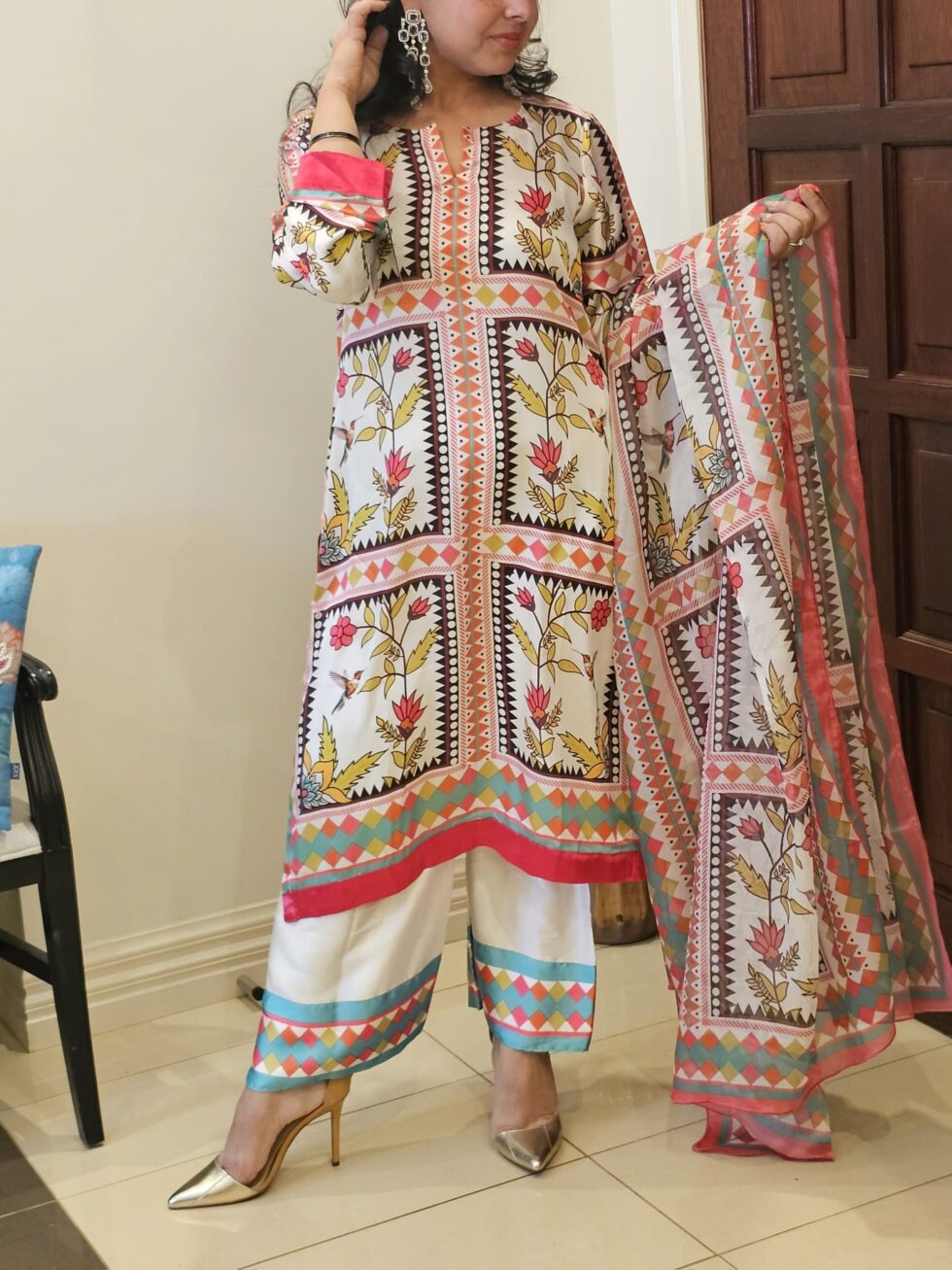 The ensemble includes a fluid silk dupatta, richly printed to mirror the suit’s motif, adding grace and movement to your look. Paired with tailored silk barrel pants, this outfit offers a chic silhouette that flatters while staying comfortably luxe.