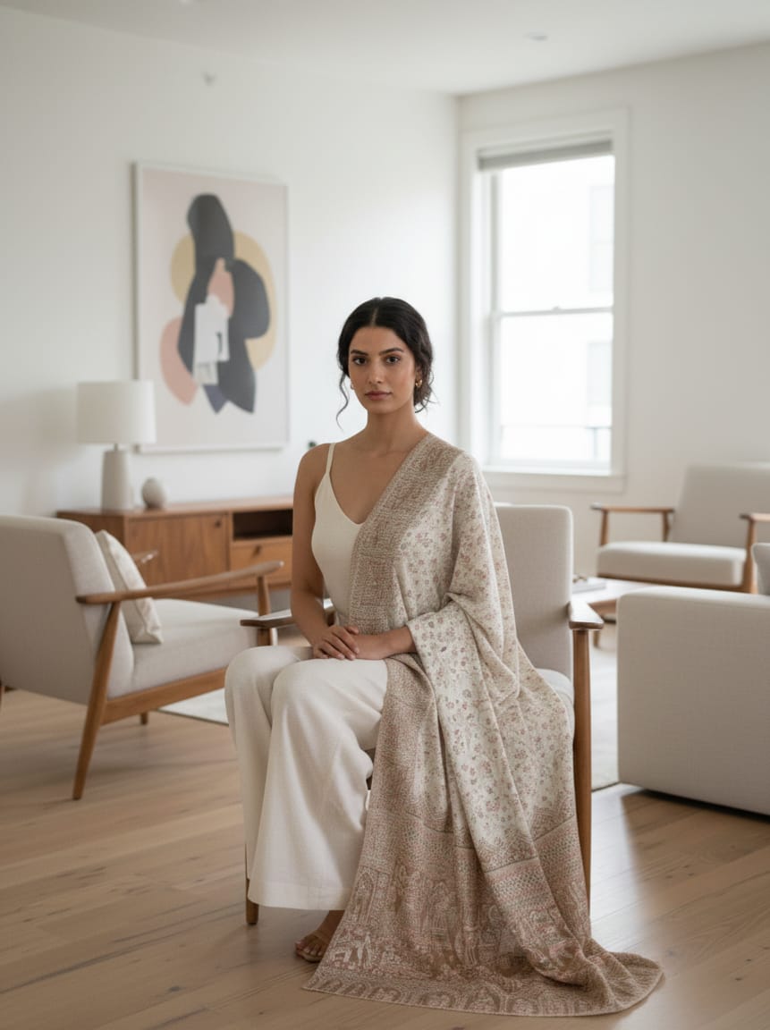 This luxurious pashmina features a soft, ethereal ivory canvas beautifully anchored by an intricately woven heritage border in subtle blush and nude tones. Versatile enough for both special occasions and elevated daily wear, it is a piece of wearable art that promises unparalleled warmth and lasting elegance.