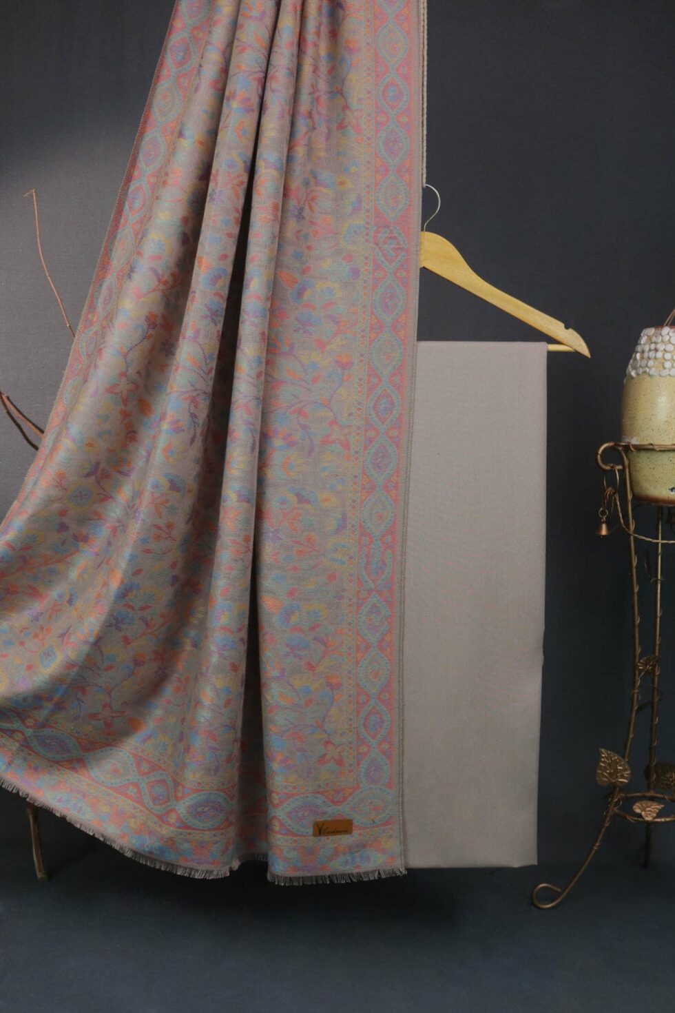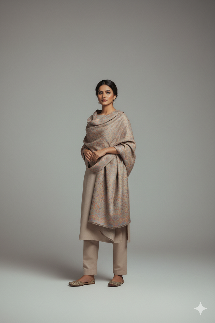 The Kurta and Trouser material are crafted from premium quality Pashmina . The solid color provides the perfect foundation, allowing the artisanal shawl to truly shine while maintaining a versatile, flattering silhouette. The fabric is renowned for its incredible softness and lightness, coupled with superior insulating properties.