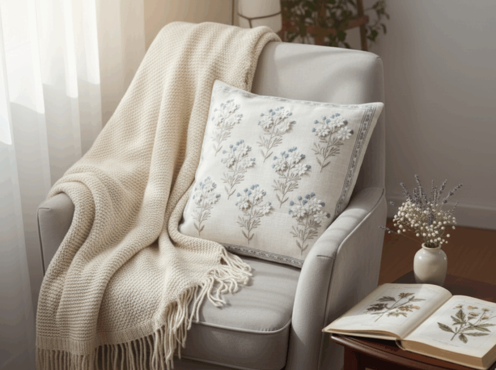 Bring the tranquility of a summer garden indoors with our Heirloom Bouquet Cushion Cover. Crafted from Premium Cotton and featuring delicate 3D floral embroidery in soft blue and white. An exquisite touch of elegance for your sofa or bed.